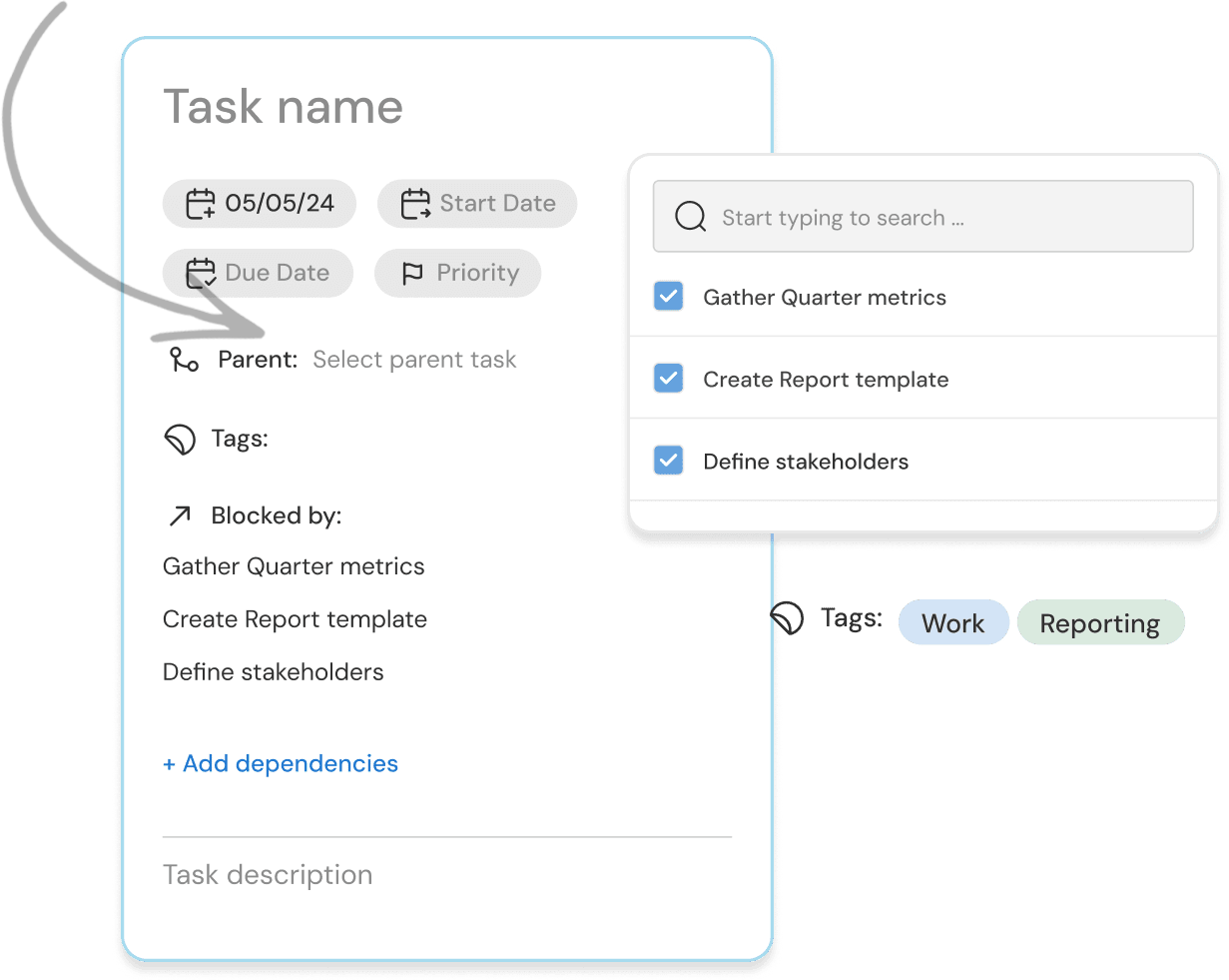 Quickly add or copy-paste tasks from Jira, Asana, email, Slack, quick notes, or anywhere else. Set parents, children, due dates, priorities, and blockers naturally. No complex setup required.